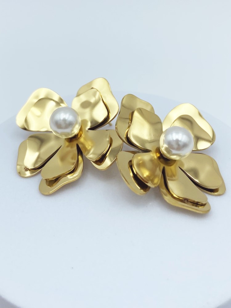 Par de aretes hermosos tipo flor, con perla en el centro de acero inoxidable chapado en oro de 14k.