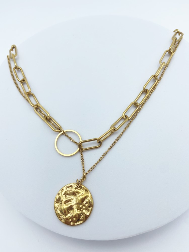 Hermoso collar dorado con dije de circulo de acero inoxidable chapado en oro de 14k.