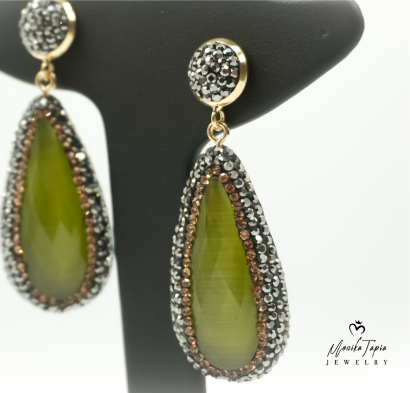 Elegante par de aretes hechos a mano, detallado con imitación de pequeños diamantes preciosos alrededor de imitación Gema color Verde